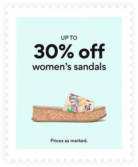 Hurry in and take up to 30% off on women's sandals in store for a limited time.